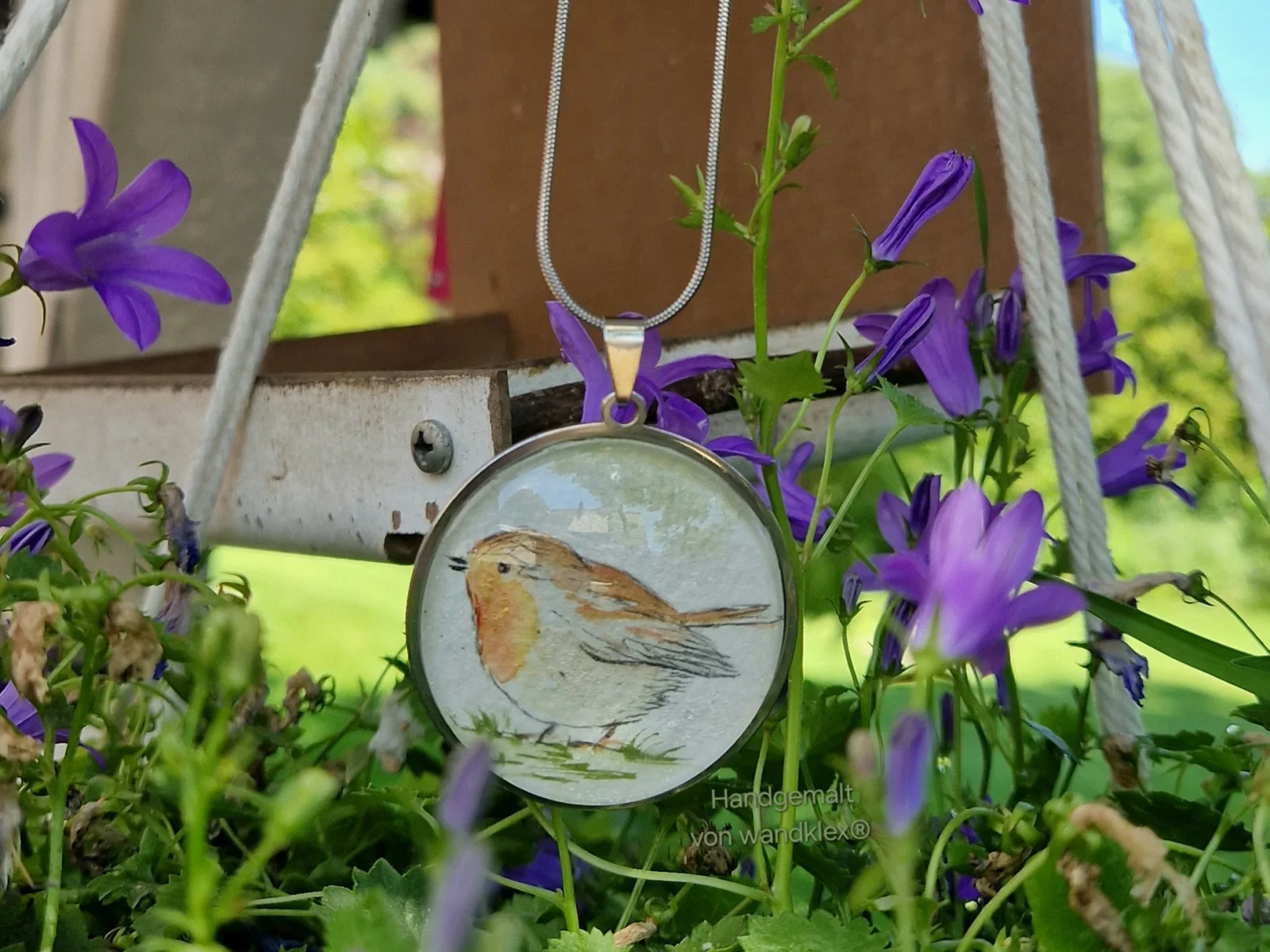 Die bisherige Rotkehlchen-Serie lasse ich auslaufen. Aktuell sind noch 2 handgemalte #wandklexschmuck-Versionen davon da, einmal in 25mm in Edelstahlanhänger, einmal 40mm die wahlweise als Anhänger oder auf Pillendose montiert wird. Zu finden hier: #birds #robin #fediArt #amastoArt #creativeToots