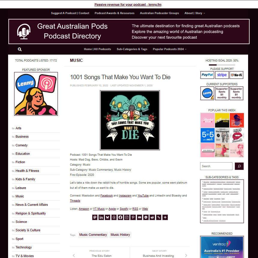 Great Australian Pods Podcast Directory: https://www.greataustralianpods.com/1001-songs-that-make-you-want-to-die/