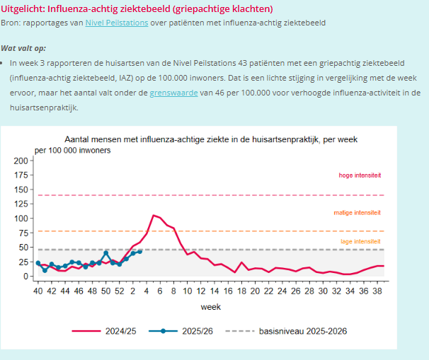 Met een stijging van de 'griepachtige klachten' maar deze blijft nog net beneden het epidemisch niveau. Intussen blijft het duidelijk achter bij de griepgolf van vorig jaar.