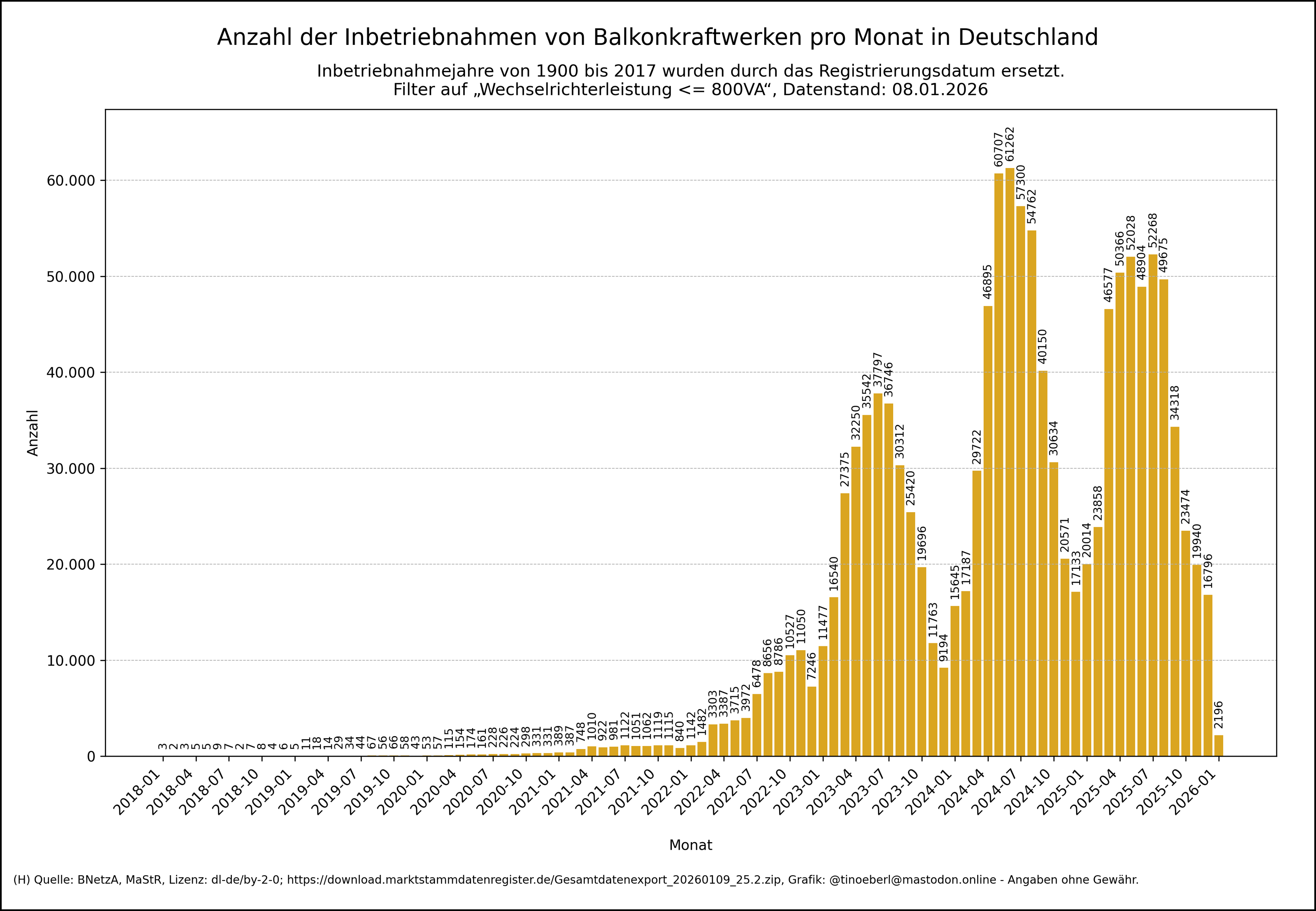 Anzahl der Inbetriebnahmen von #Balkonkraftwerken pro Monat in #Deutschland mit Stand vom 08.01.2026.