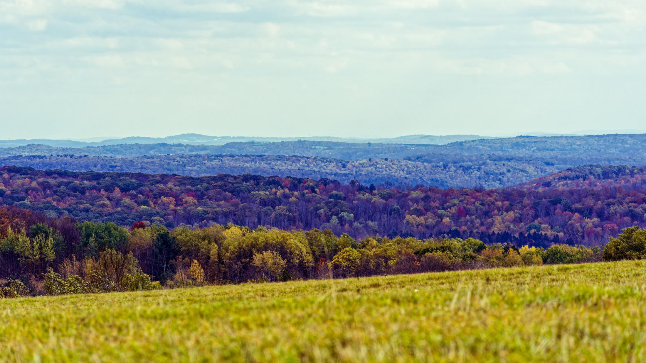 View of hills covered by forest canopy looking south from a high point along the Fingerlakes Trail in Caroline -- a rare place south of Cayuga lake where you can find a commanding view