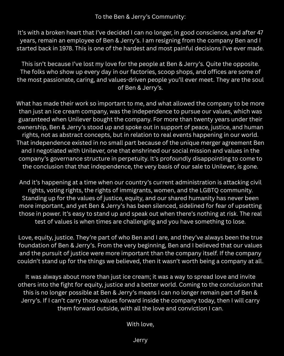 The breaking of a promise of independence that allowed Ben & Jerry's to pursue peace and social justice issues has caused Jerry to leave the company in sadness.