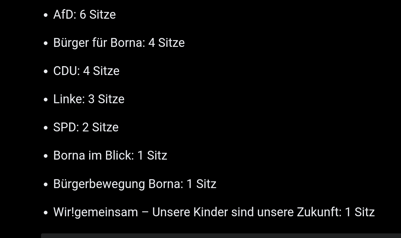 Spannend dazu ist die Zusammensetzung Des Stadtrats in Borna. Von linksgrüner Verbotspolitik kann hier nämlich keine Rede sein, denn bei nur 2 Gegenstimmen haben Mind. 8/10 AfDer und CDUler zugestimmt.