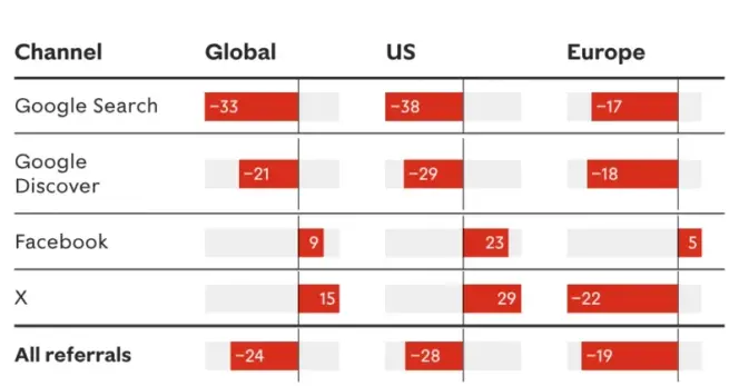 Chartbeat data: global Google search referrals to publishers fell by 33% in the year ending November 2025, with US-specific organic search traffic down 38% (Charlotte Tobitt/Press Gazette)