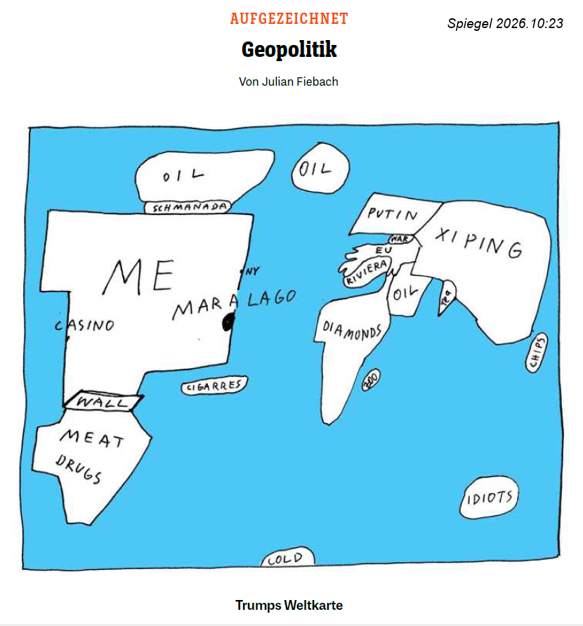 …"Trumps Weltkarte": eine #Geopolitik-#Karikatur von Julian Fiebach aus dem Spiegel 10/2026 🗺️