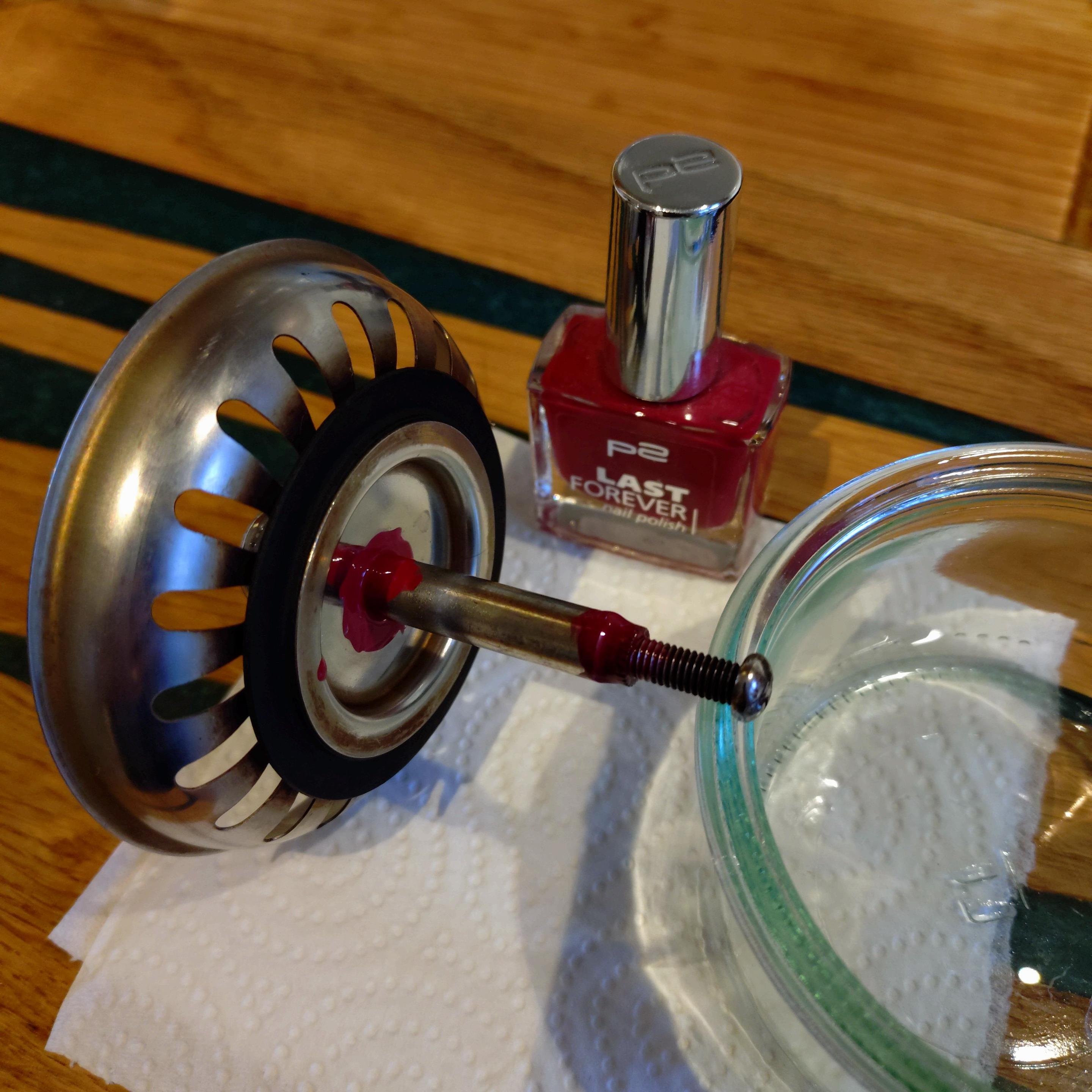 aus der reihe "#lifehacks" im dezember: muttern nach altem nagellack fragen, um endlich mal die sich ständig wieder lösenden schrauben am küchenspülenabflusseinsatzsieb zu fixieren. 🙃