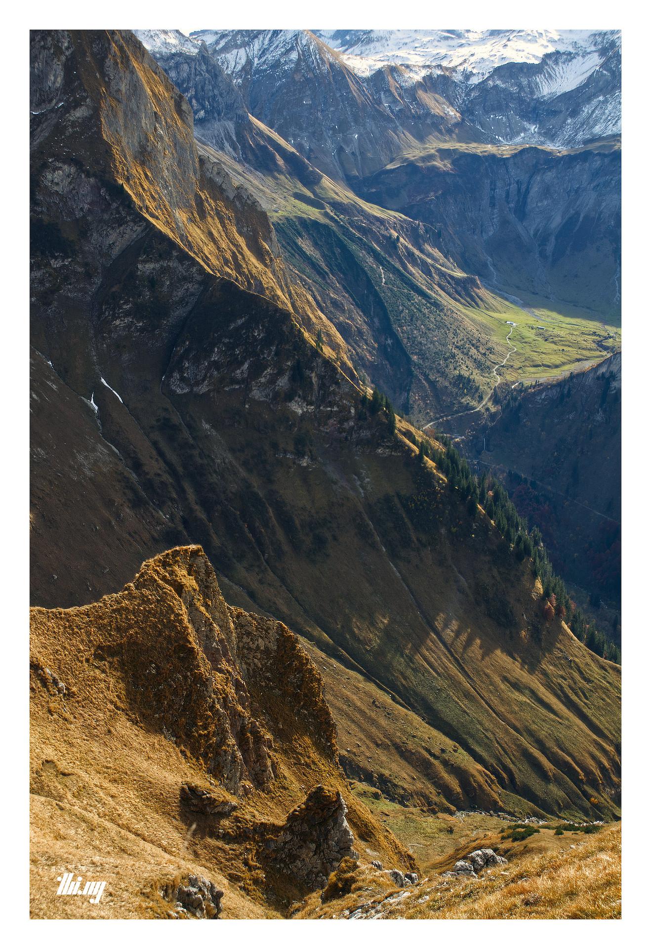 (View down into Oytal from a precarious section of the ridge path near Laufbacher Eck & Schneck, late October 2021)