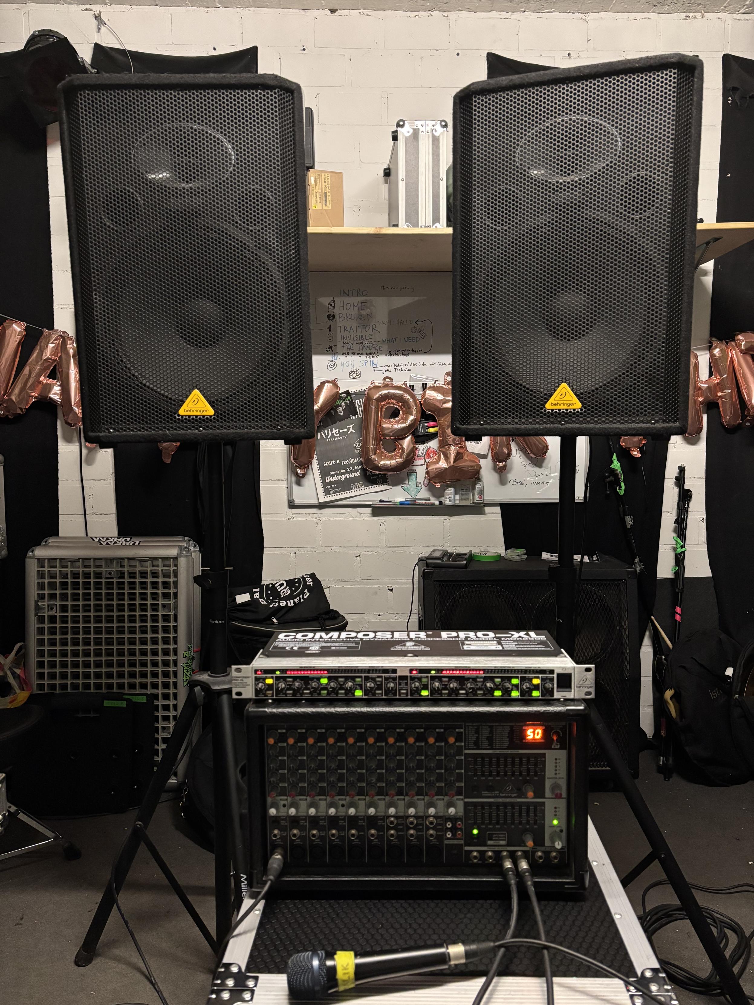 - Behringer Eurolive VS1520 (passive Boxen) inklusive Stativen
