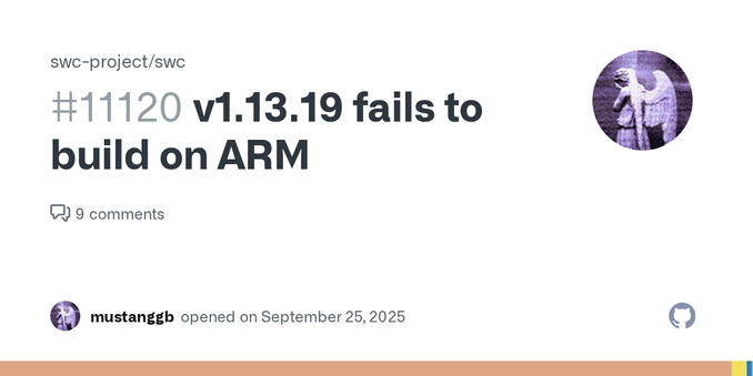 I've broken my own "vendor everything" rule and now it's bitten me on the arse: https://github.com/swc-project/swc/issues/11120#issuecomment-3338509762