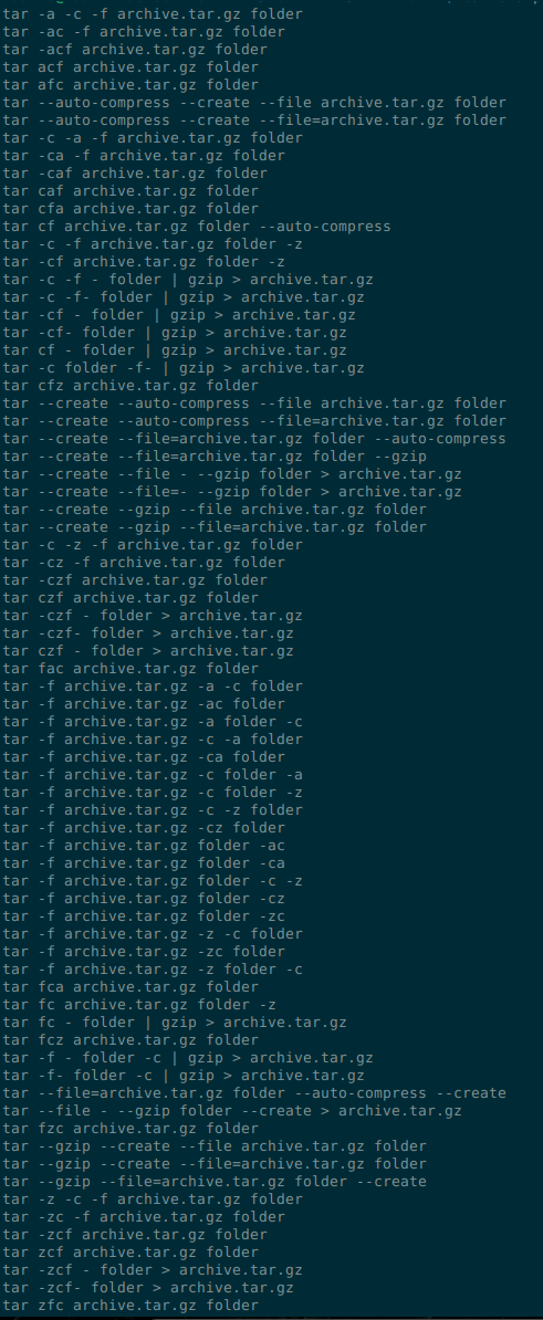 People say tar is hard but off the top of my head here are 298 ways to make a gzip compressed tar archive of a directory and its contents with GNU tar.