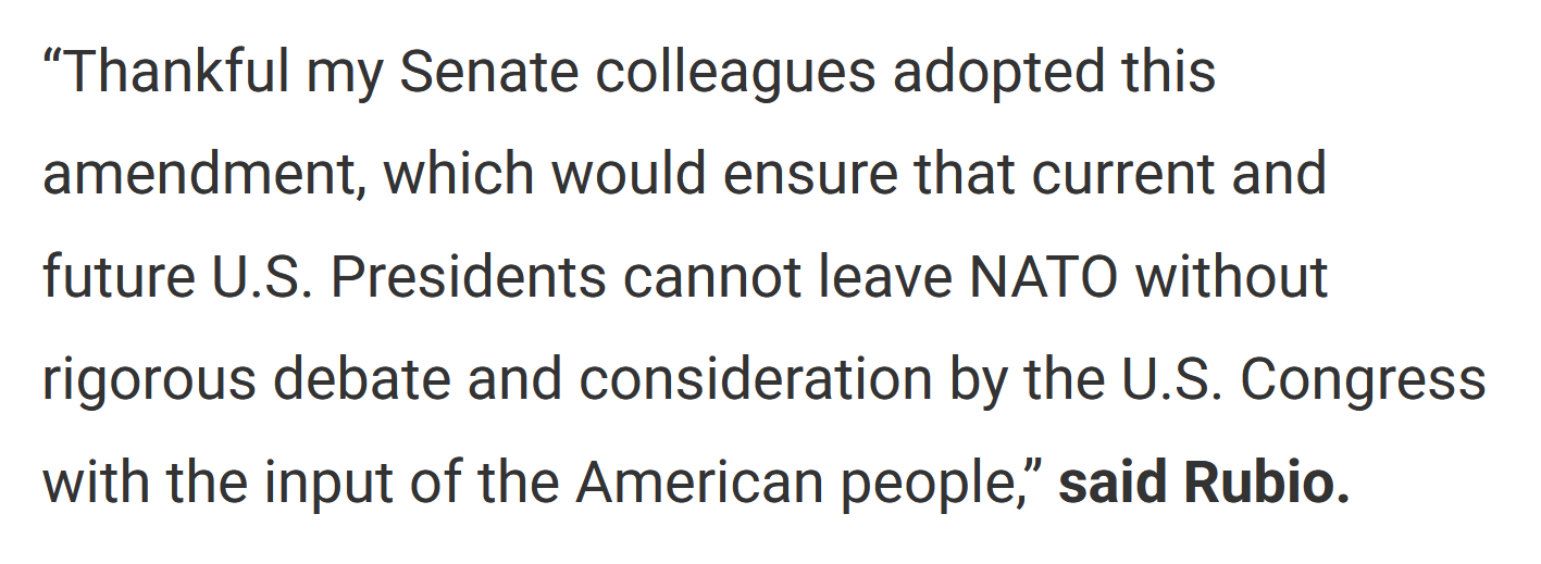 Quote from “Kaine & Rubio Applaud Adoption of Their Amendment to the NDAA to Prevent Any U.S. President from Leaving NATO” 19 July 2023: