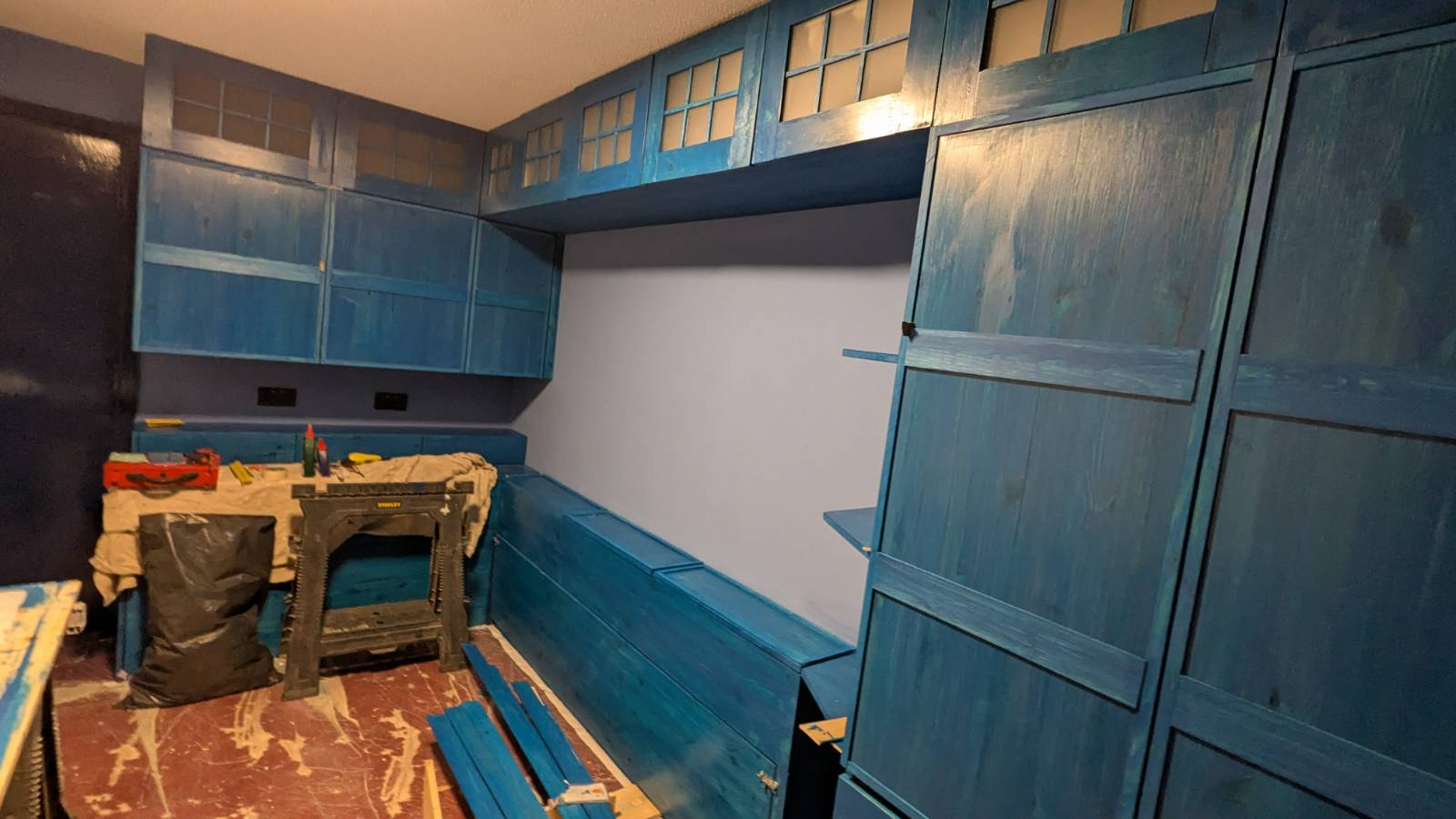 The frames for the window doors look to be mostly completed, the doors that will make the blinds are up (though probably presumably will come down again to have mirrors attached? Maybe?). Lots of holes in wood filled. Stupid natural products. MDF don't have no holes, or grain at all.