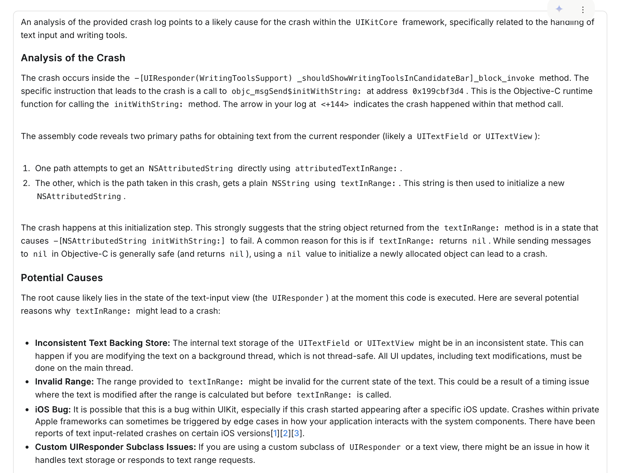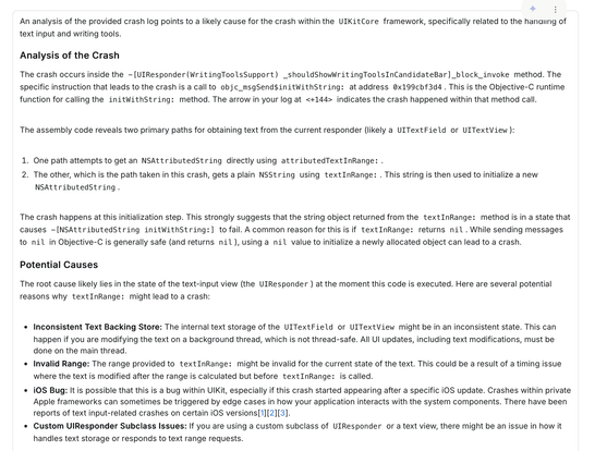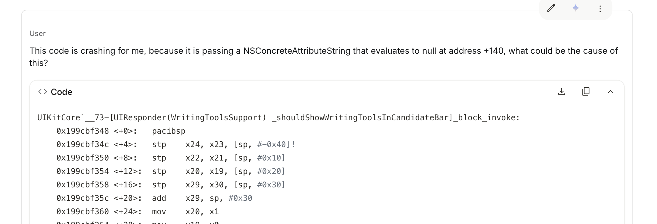 Sometimes, when I get a native crash and I have no idea what happened, I paste the disassembly into aistudio and have it explain to me what is going on.