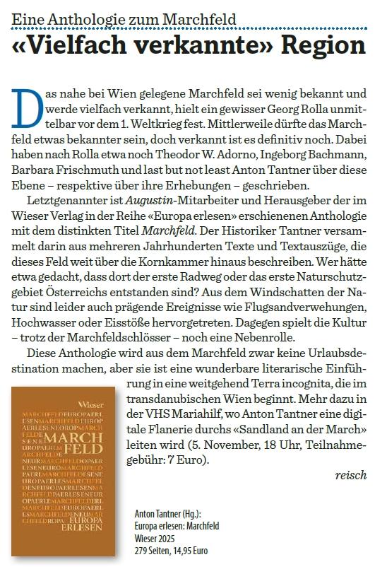 Oh, für den ab heute auf den Straßen Wiens erhältlichen Augustin hat Reinhold Schachner eine Besprechung des Europa Erlesen-Marchfeld-Bands verfasst - was für eine Aufzählung von Autor*innen 😄!