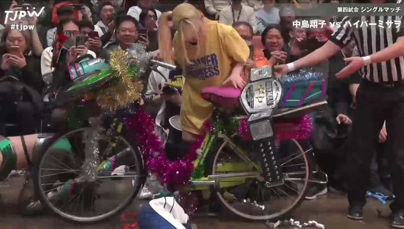 The bicycle named: "HyperMi Dramatic Dream", which was 'modified' by Hyper Misao (A wrestler) ran over Shoko Nakajima (another wrestler) and long enough to get the 3 count.