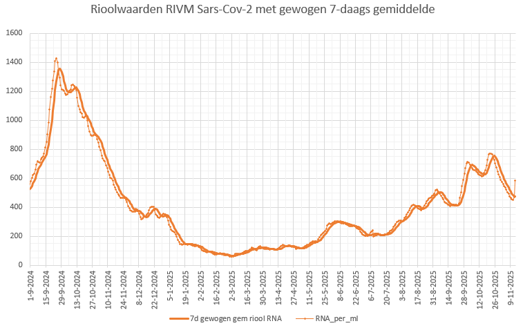 Met vandaag een verdere daling, tot onder de 500, die echter in de laatst gemeten dagen wel weer afvlakt.