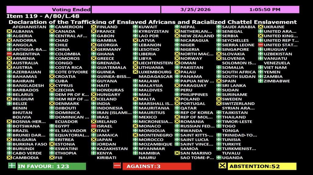 Detail on voting for the #UnitedNations #Resolution UN A/80/L.48: “Declaration of the Trafficking of Enslaved Africans and Racialised Chattel Enslavement,” recognising the Transatlantic #slave trade as amongst our…