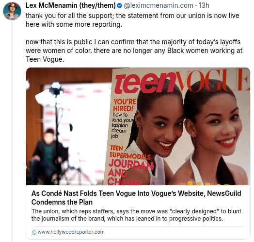 One of USA’s last remaining independent journalistic outlets… *checks notes*… Teen Vogue… is shuttered. https://romancelandia.club/@herhandsmyhands/115491522193236227