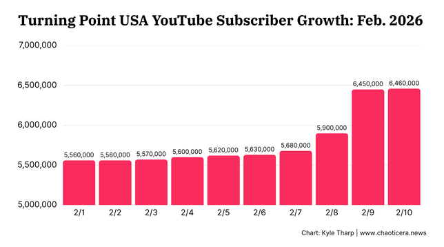 Turning Point USA added 900K followers on YouTube between February 2 and February 9, the day after it hosted an "alternate" Super Bowl halftime show (Kyle Tharp/@kylewilsontharp)