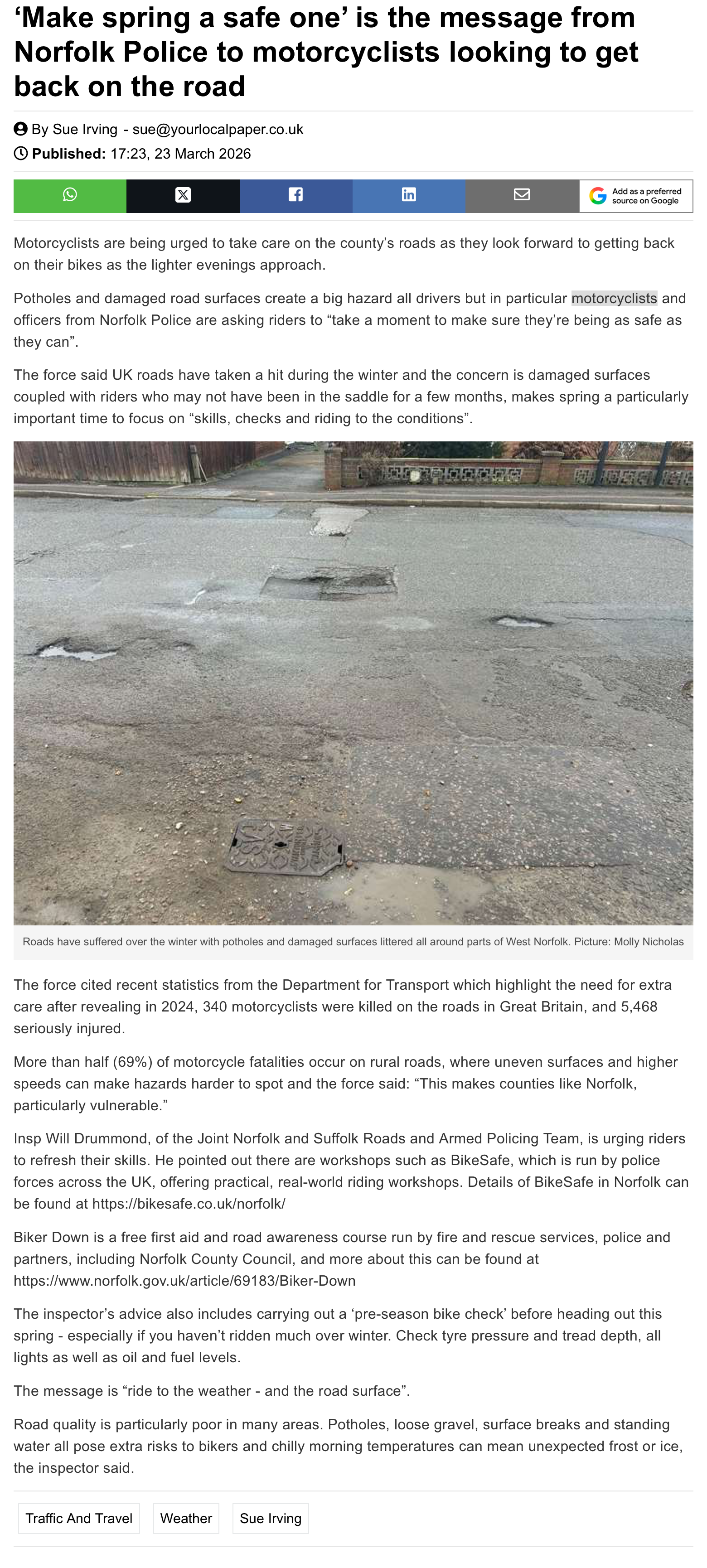 I can ’t help but think when I read these stories on the road conditions that, if you can’t ride according to the conditions and are not able to avoid a couple of potholes, you probably shouldn’t be riding at all...