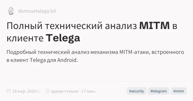В анализе пользующегося дурной славой приложения #Telega, кроме MitM, были упомянуты две интересные вещи: слив authKeyId на сервера telega.info и отключение Perfect Forward Secrecy.