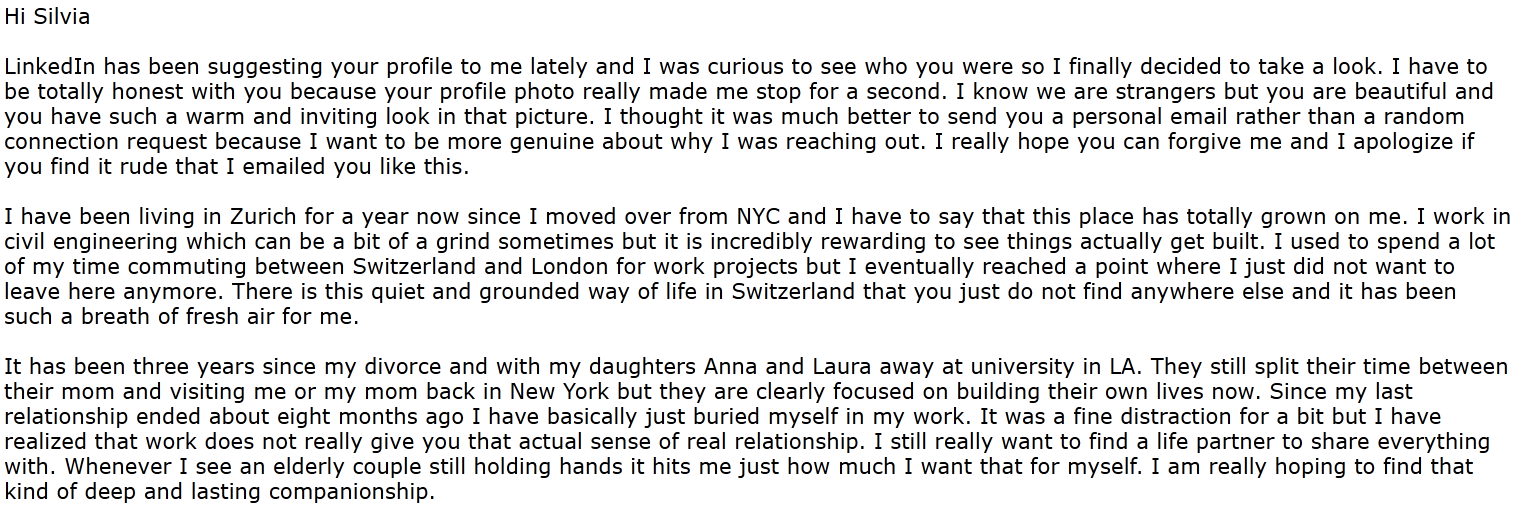 Oh, wow. Love Scam neuerdings per Email auf geschäftliche Email-Adressen, mit bezug zu LinkedIn (wo meine Adresse übrigens NICHT öffentlich ist)? Neues Level.