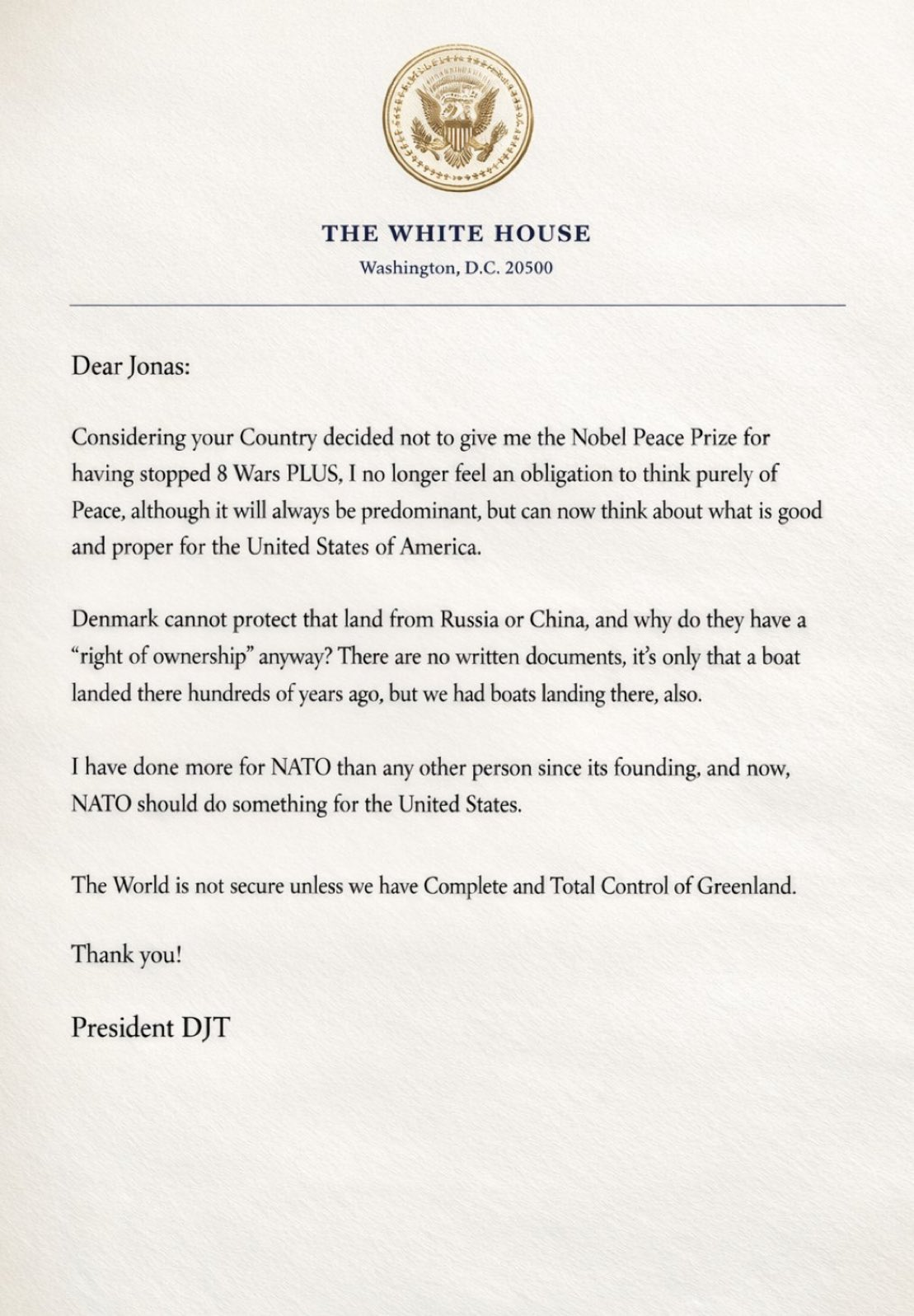Let's begin by quoting, in full, a letter that the president of the United States of America sent yesterday to the prime minister of Norway, Jonas Gahr StŸre.