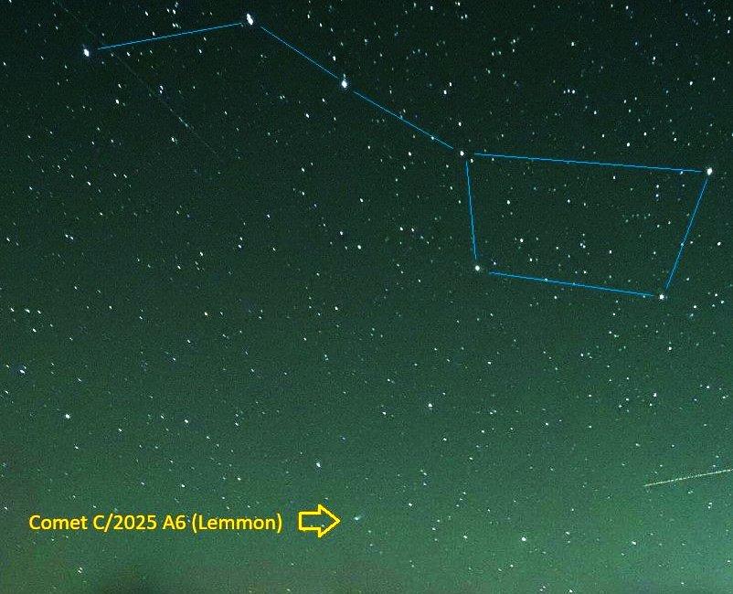 Tonight comet #Lemmon was picked up by several wide-angle webcams in Europe: https://x.com/JAtanackov/status/1977456751831093352 at the Raxalpe in Austria (left) and https://bsky.app/profile/huubeggen.bsky.social/post/3m2zhian3722b in Abisko, Sweden, together with aurora. Its brightness - https://cobs.si/obs_list?id=2606 - is around 5.2 mag. now and the degree of condensation 5 to 7, so for these cameras the comets looks like a slightly fuzzy green five-mag. star.