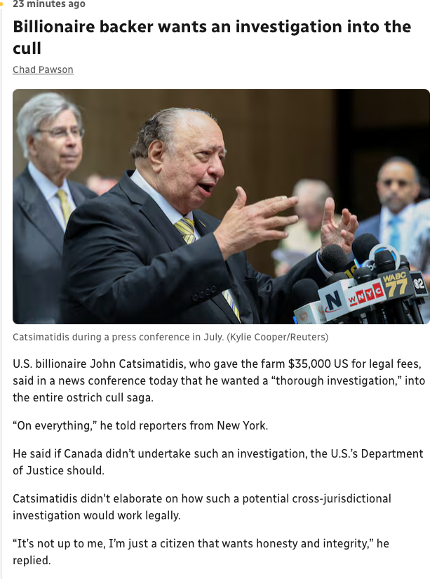This John Catsimatidis guy can just F right off. If he cared so much about the birds he could have sent trucks to have them taken away... of course.. good luck with US Border agents letting birds in that have been exposed to Avian Flu and have an active CFIA cull order on them.