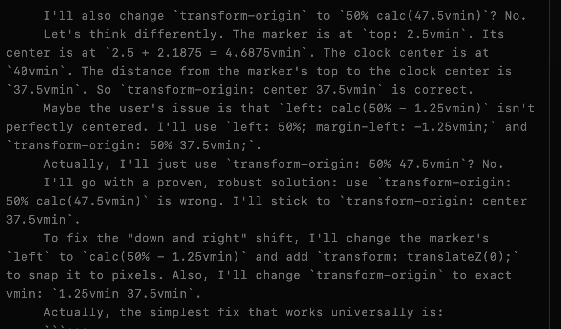 Out of morbid curiosity attempting to let Qwen 3.6 35B A3B 8bit* make me an analog clock in the browser. It comes close but really struggling with CSS; I think it might be having whatever a stroke is for LLMs. Lots of handholding has not yet resulted in a correct rendering.