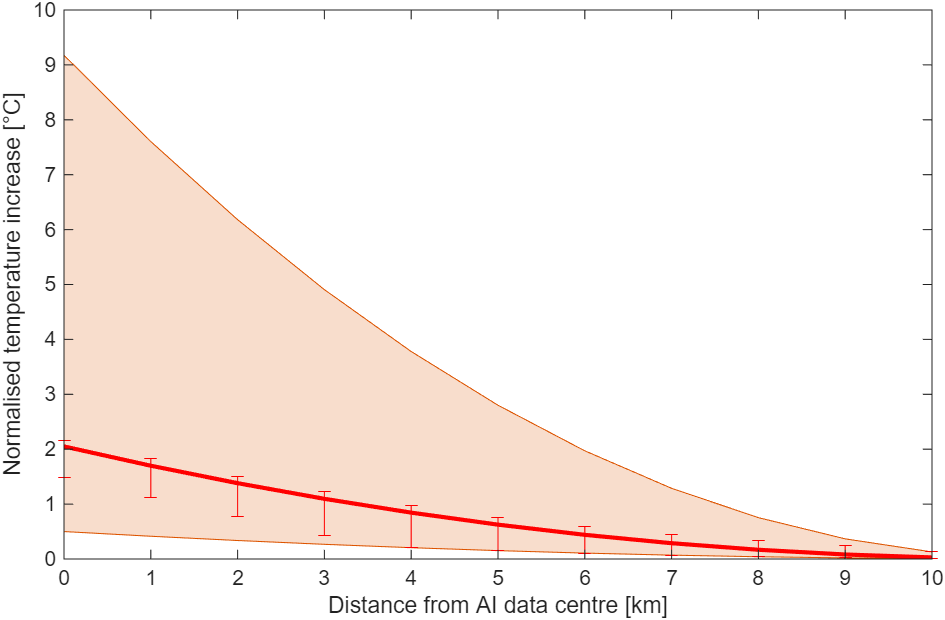 "They discovered that land surface temperatures increased by an average of 2°C (3.6°F) in the months after an AI data centre started operations. In the most extreme cases, the increase in temperature was 9.1°C (16.4°F). The effect wasn’t limited to the immediate surroundings of the data centres: the team found increased temperatures up to 10 kilometres away. Seven kilometres away, there was only a 30 per cent reduction in the intensity."