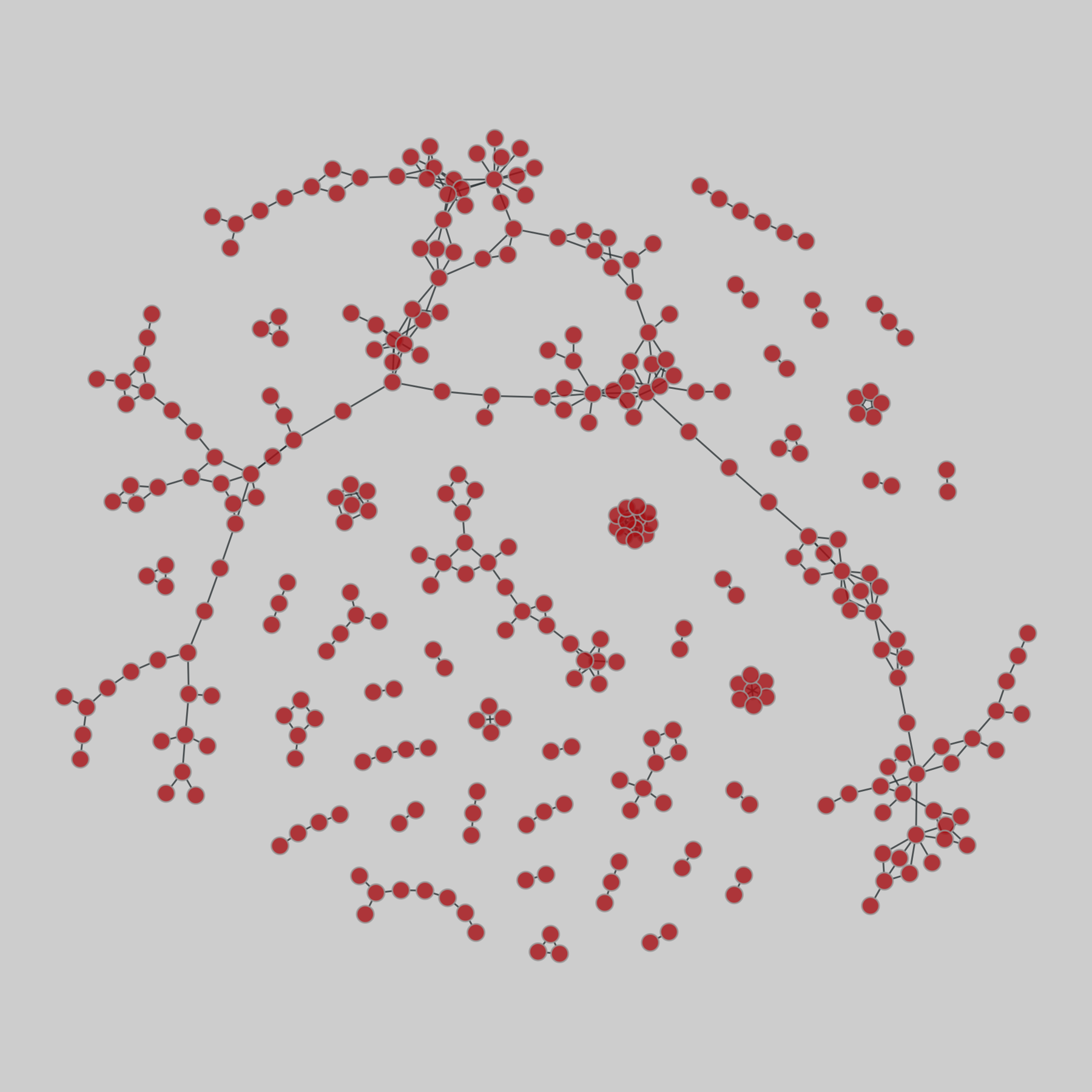 A network of protein-protein binding interactions among yeast proteins. Nodes represent proteins found in yeast (Saccharomyces cerevisiae) and an edge represents a binding interaction between two proteins.