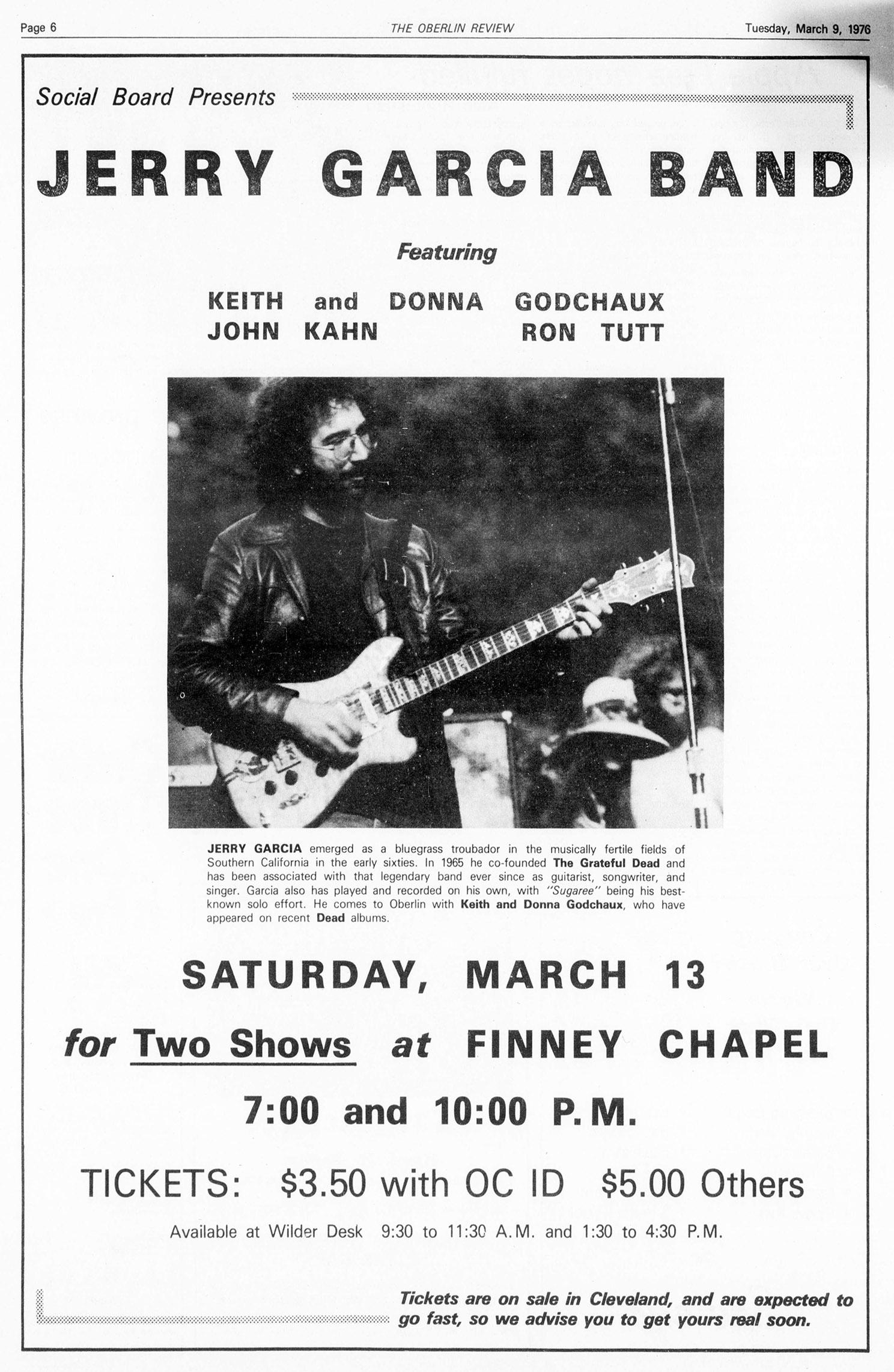 50 years ago tonight, the jerry garcia band in ohio at oberlin’s finney chapel, with teenage @… working as guard at the backstage door. spring ’76, show #5. https://