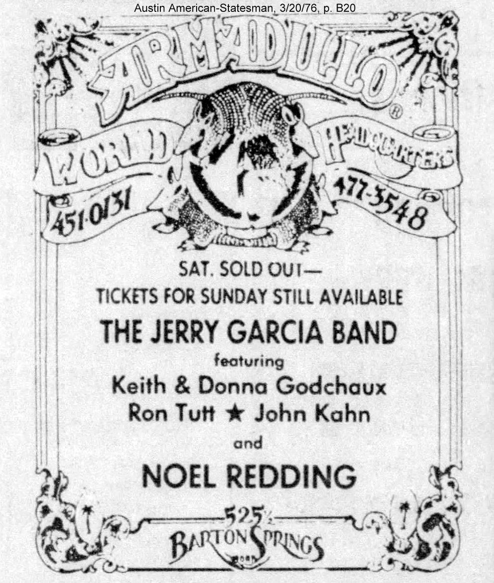 50 years ago tonight, the #JerryGarcia band in #austin at the infamous armadillo world headquarters. only the 2nd set from the 1st night circulates. former hendrix bassist noel redding opens. spring ’76, show #9.