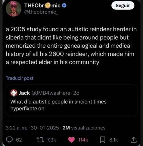 “a 2005 study found an autistic reindeer herder in siberia that didnt like being around people but memorized the entire genealogical and medical history of all his 2600 reindeer, which made him a respected elder in his community”
