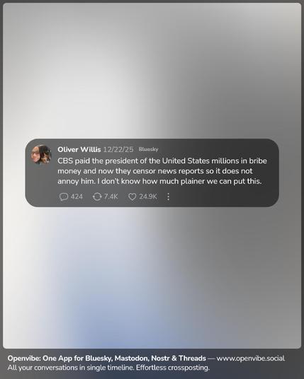 "CBS paid the president of the United States millions in bribe money and now they censor news reports so it does not annoy him. I don’t know how much plainer we can put this."