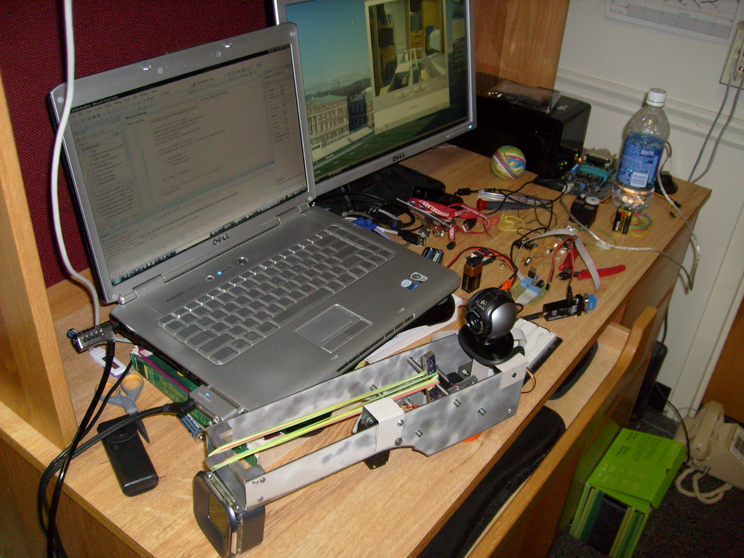 Writing firmware on my first laptop, for the PIC12F683 (the first microcontroller I ever used), on my first embedded project ever (robotic rubber band gun turret) freshman year of college, bodged together on perf board.
