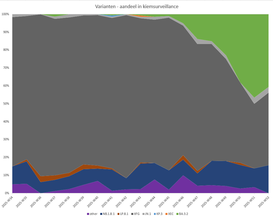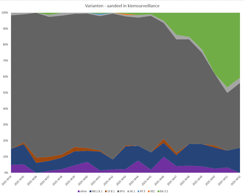 De BA.3.2 heeft inmiddels de XFG bijgehaald. Geen van deze varianten is dominant, beide zo'n 40%. Maar over twee weken zullen we toch echt een dominante BA.3.2 zien. Met veel meer samples van week 52. Wellicht was BA.3.2. tegen de jaarwisseling al dominant? Dat zou wel de stijging van afgelopen woensdag verklaren.