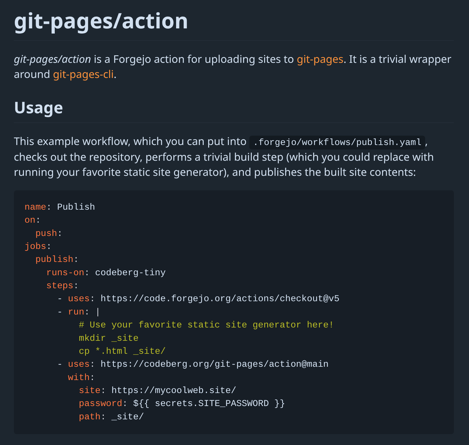 made a Forgejo Action wrapper for publishing to git-pages/Grebedoc https://codeberg.org/git-pages/action