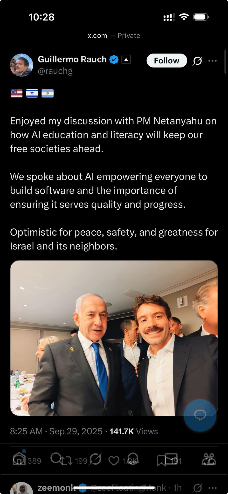 Here's the CEO of Vercel chatting with Netanjahu about AI _today_.