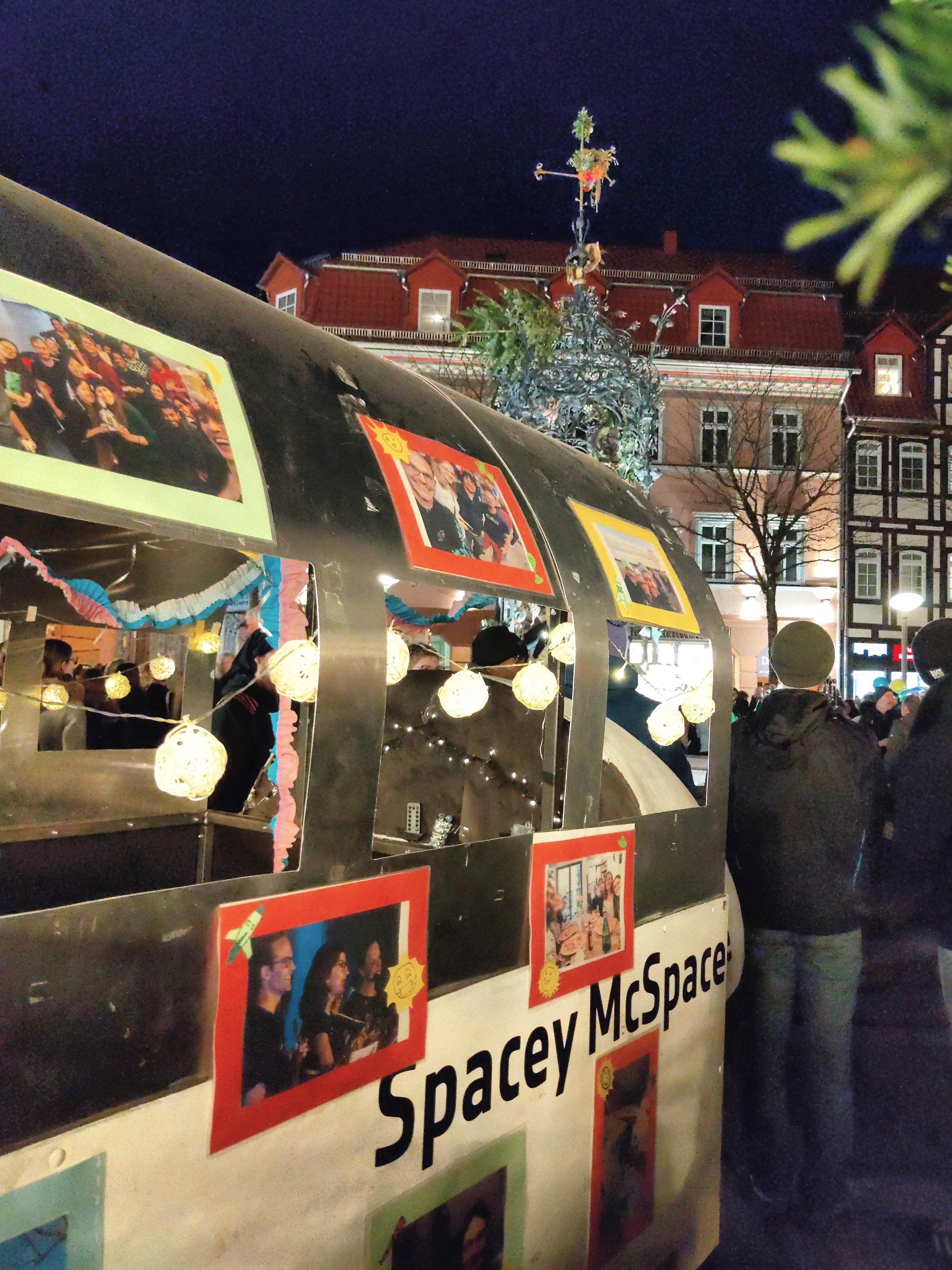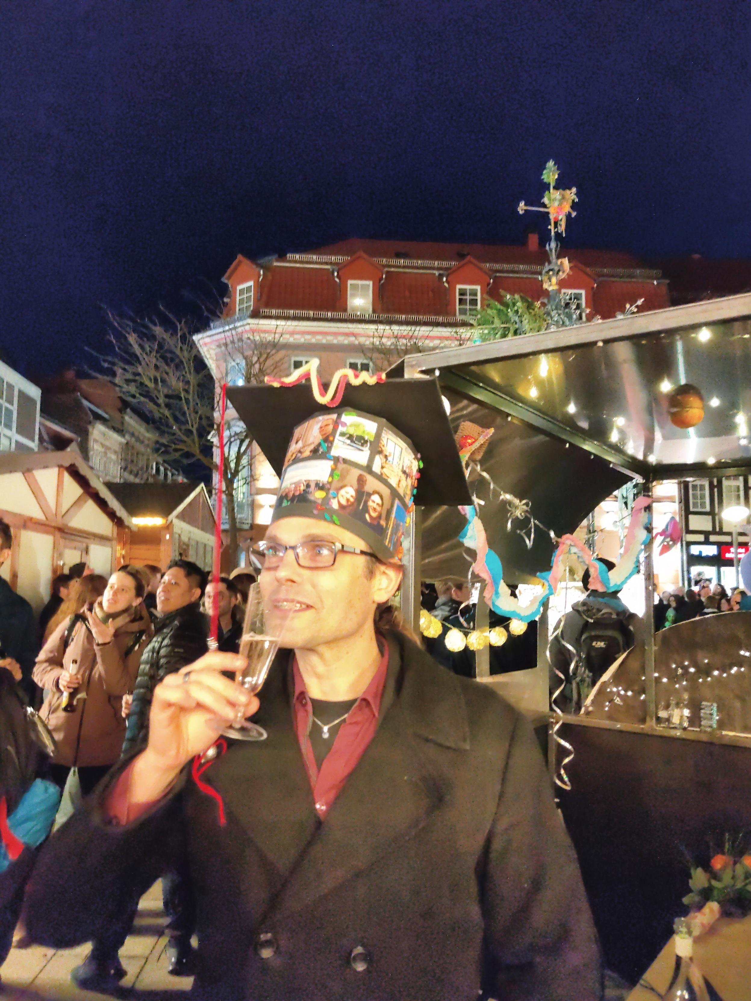 It's Gänseliesel day in Göttingen! Freshly minted PhD graduate Johannes Hölken attended the official ceremony at the Aula, has been picked up by us and ferried to the Gänseliesel fountain in the city center, and is about to bring the goose girl on the top of the fountain some flowers. Meanwhile, other carts around us are also interesting to look at!