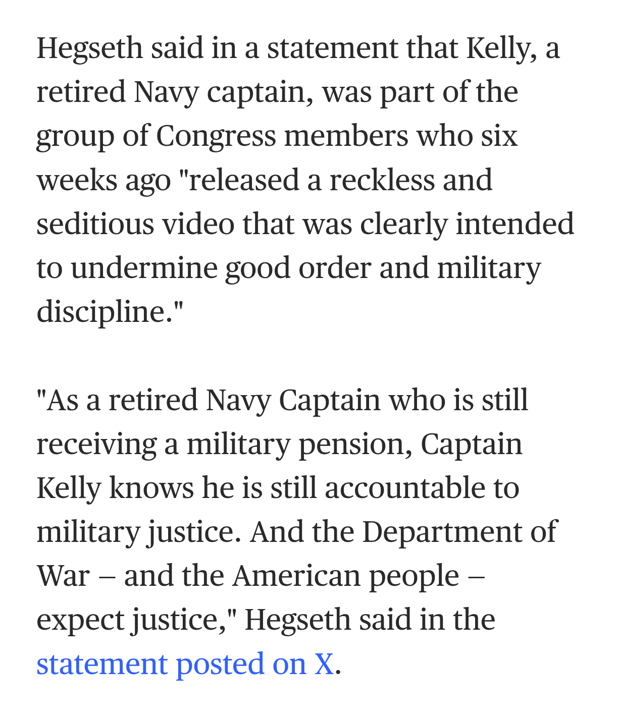 'Defense Secretary Pete Hegseth said Monday that the Pentagon is taking steps to downgrade Democratic Sen. Mark Kelly's military retirement rank and pay because of the lawmaker's "seditious statements." '