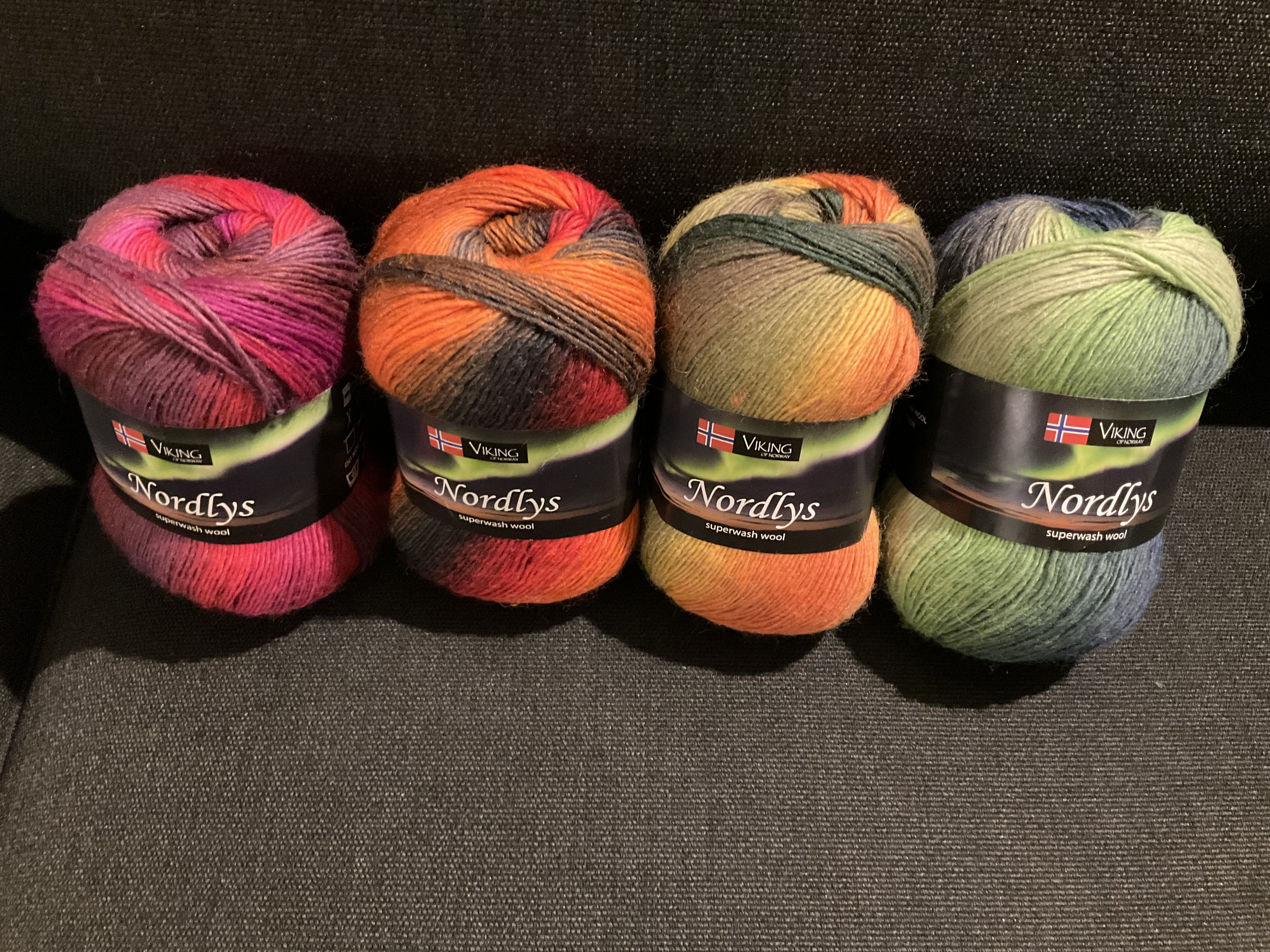 Mag nicht immer nur Socken stricken aus der Polarlichtwolle. Die beiden rötlichen links gingen wohl auch zusammen, dann wäre es ein Muster für 200g.