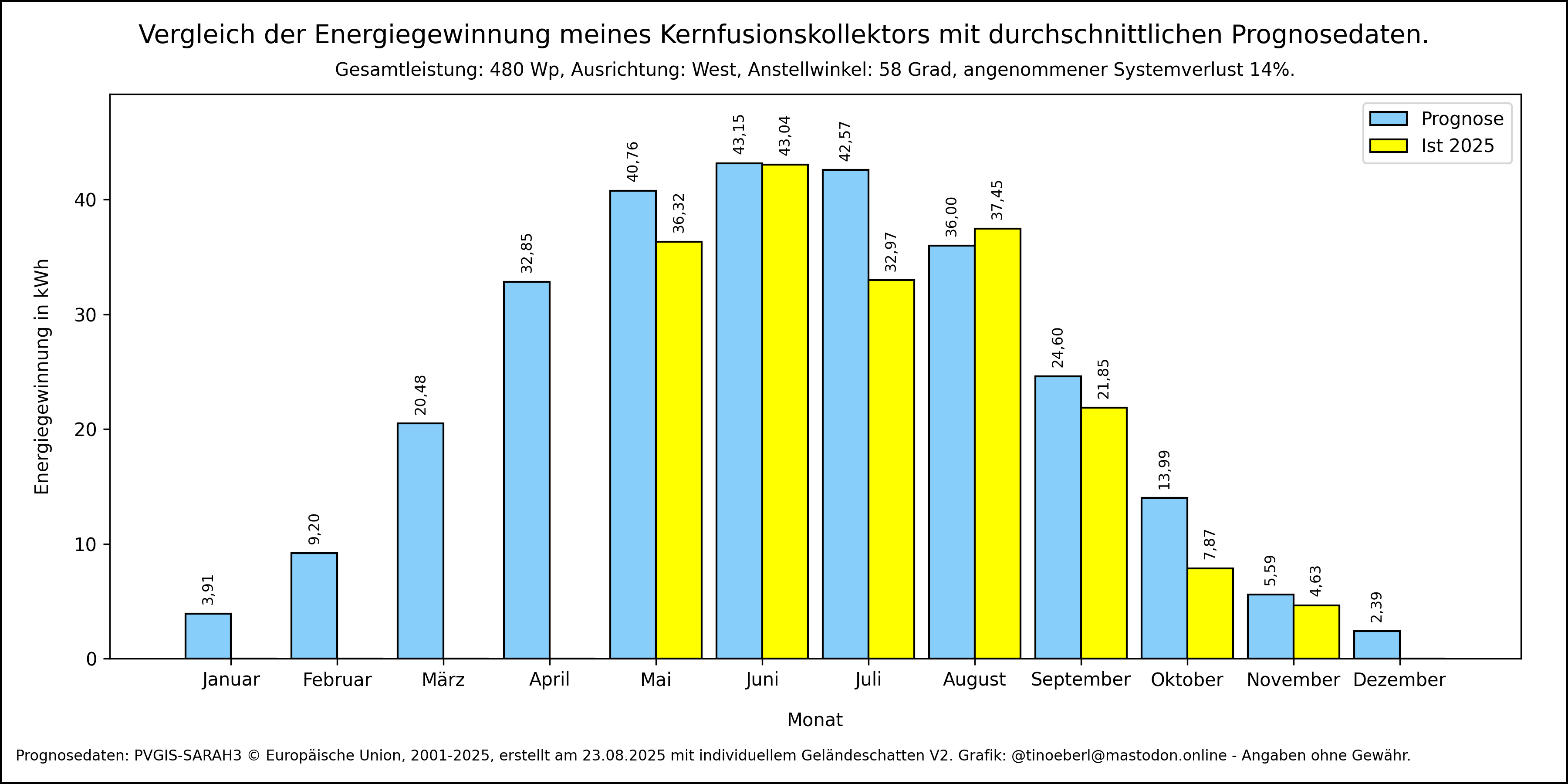 Die monatliche #Energieerzeugung meiner #Kernfusionskollektoranlage im Vergleich zu Prognosedaten aus einer Simulation.