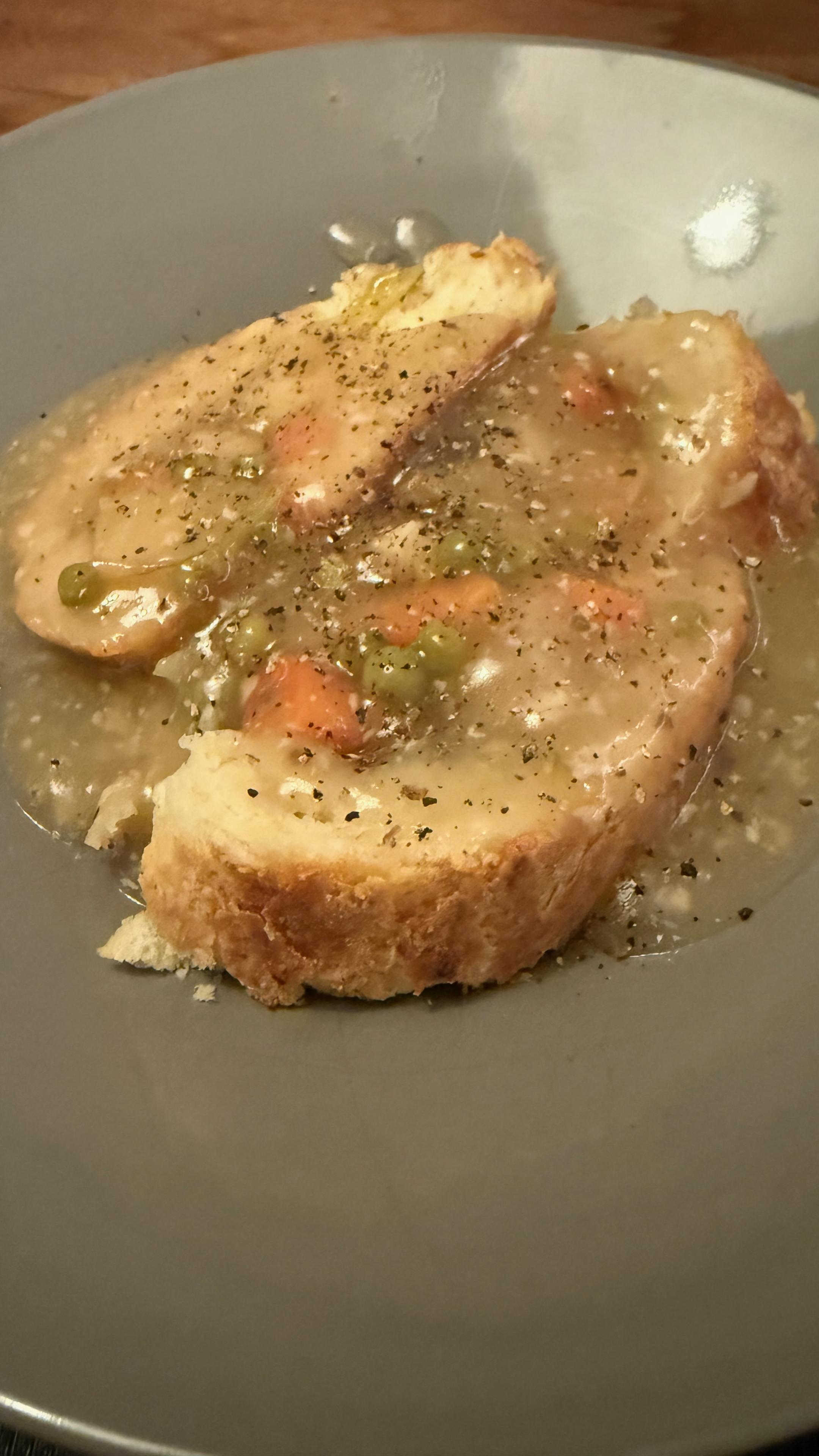 It gets a "sauce" of either leftover extra-thickened gravy or a béchamel-ish white sauce. It's pretty tasty and the fresh bi…