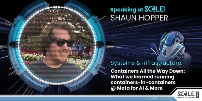 Shaun Hopper, Phong Nguyen will speak on 'Containers All the Way Down: What we learned running containers-in-containers @ Meta for AI & More' as part of our Systems & Infrastructure track at SCaLE 23x. Full details: https://www.socallinuxexpo.org/scale/23x