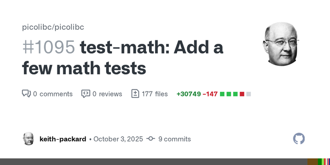 Added 'a few' math tests to picolibc today. These create reference values using nickle with its arbitrary precision floating point arithmetic. The result is a list of functions which need work to improve their accuracy. Most are "close", with known errors of 1 or 2 ulp, but tgamma is in rough shape with errors of 56 ulp for binary64 and 97ulp for binary128. The complex functions are almost all in very rough shape with errors of thousands of ulps.