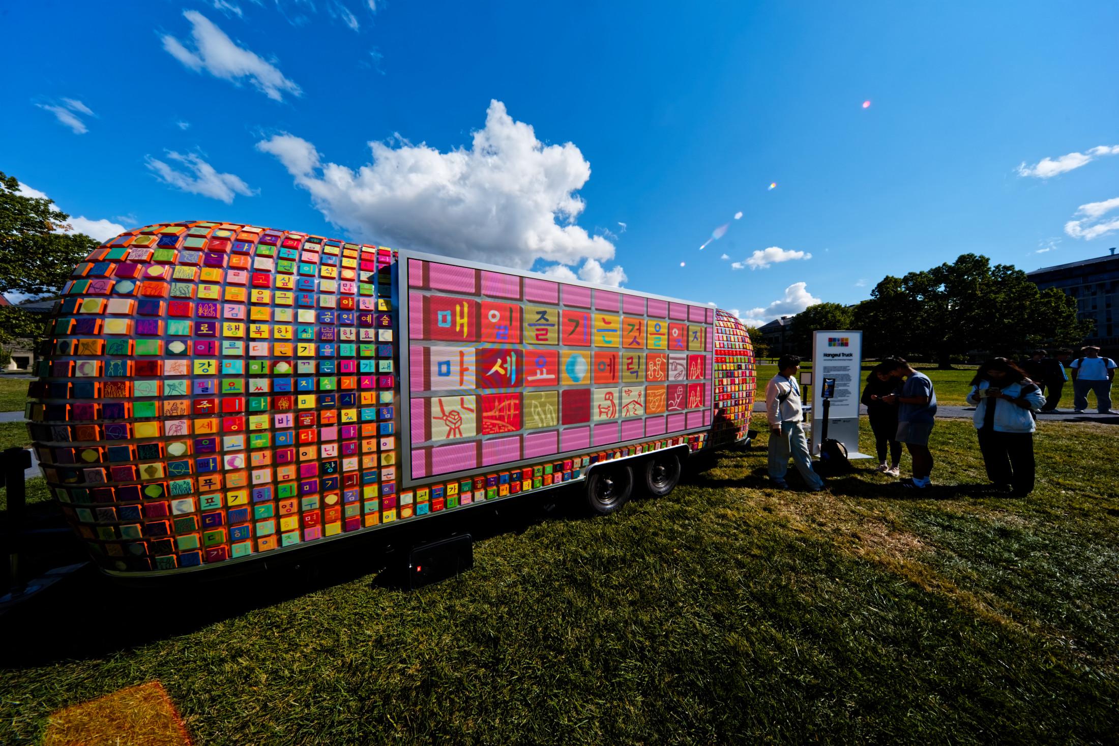 Korean Students demonstrate a giant video game on the side of a truck on the arts quad