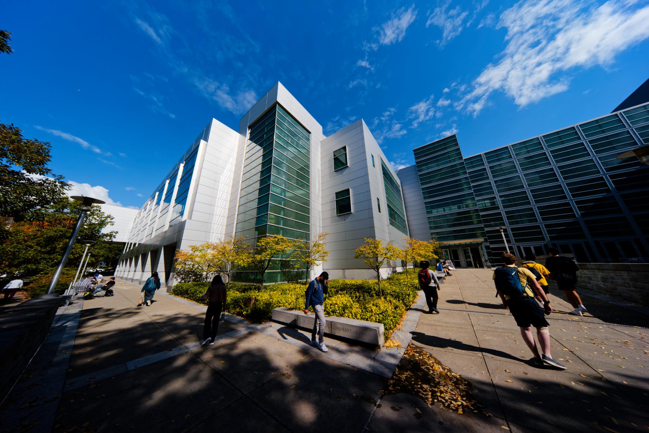 A few people look tiny in the slot between Olin and Uris Libraries from the Arts Quad to Ho Plaza