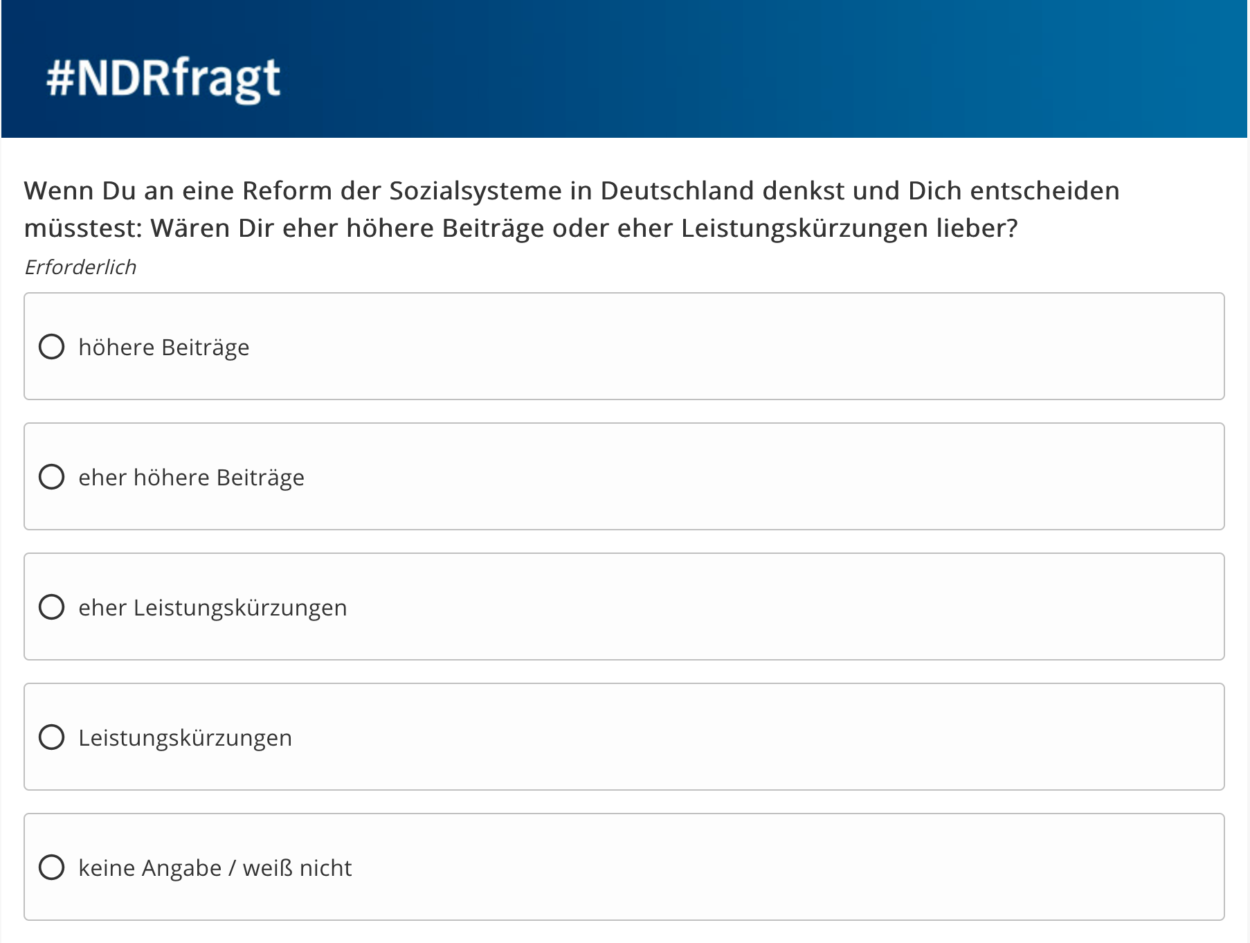 Die heutige #NDRfragt Umfrage ist an mehreren Stellen schon wieder komplett ideologisches Mett mit diesen Dichotomien. Warum sind das die einzigen beiden Möglichkeiten?